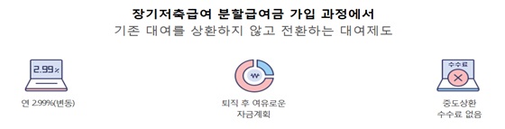 회원 퇴직 시 대여 잔액을 즉시 상환하지 않고, 장기저축 급여 가입과 동시에 이를 담보로 대여를 유지할 수 있도록 하여 안정적인 노후 생활을 보장하는 대여제도입니다.