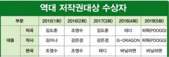 아래 표를 보시면 2018년도에 가수 선미의 노래들을 히트시키며 저작권대상을 수상한 바 있습니다.