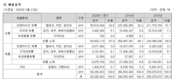 프랜차이즈 유통을 통한 햄버거, 치킨, 피자 등의 상품 매출 비율이 80%를 넘어서고 있음을