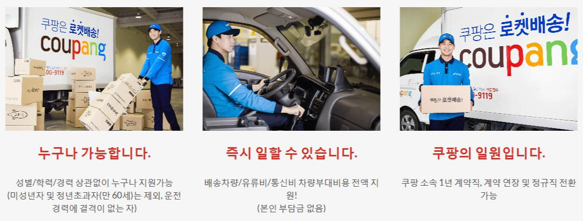쿠팡 입사조건은 경력 및 성별, 학력 등과 관계없기에 진입장벽이 낮다는 점이 최고의 장점이죠.