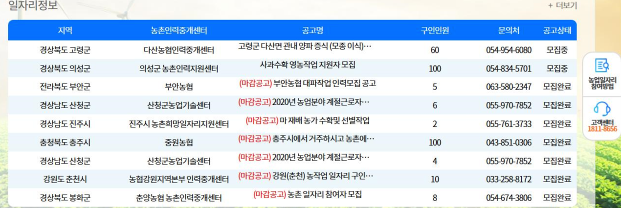 현재 시골 일자리 정보는 다음과 같이 나와 있네요.