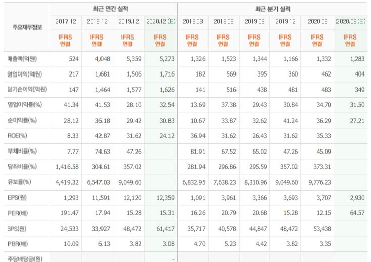 2018년 대단한 성장세를 보이던 펄어비스는 연간 매출액이 꾸준히 증가하였지만 분기별로 확인할 수 있듯이 현재는 성장세가 한층 약화된 상태라는 것을 확인할 수 있습니다.