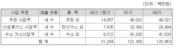 사업부문은 주정 분야, 산업용 가스 분야, 수소가스 사업 분야가 있습니다.