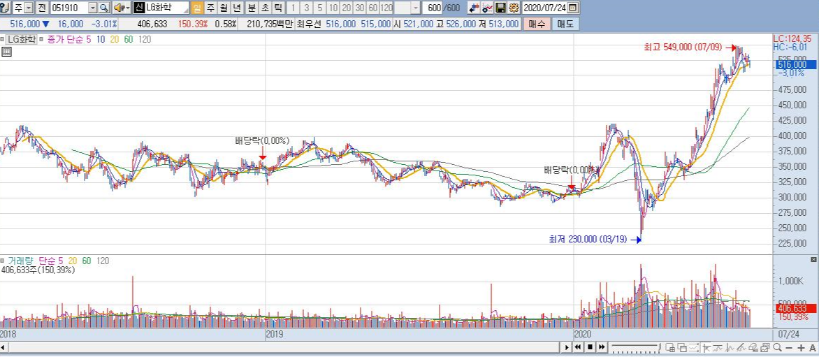 피엔티에 대해 말씀드리기 전에 배터리시장에서 세계 선두의 점유율을 차지하는 전기차 대장주 LG화학의 주가를 먼저 확인해 볼 필요가 있습니다.