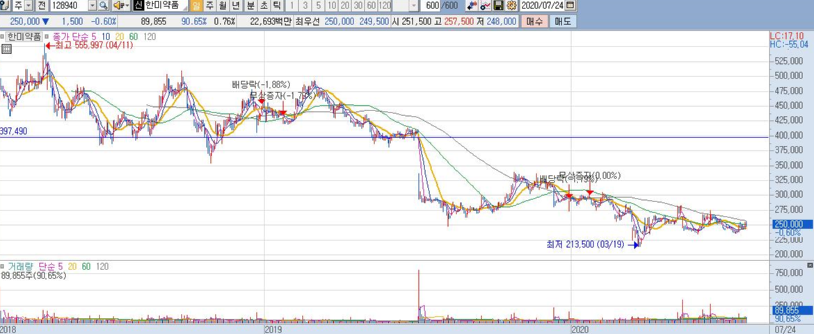 2019년 7월 초 신약기술이 반환된다는 소식에 한미약품의 주가는 1년 이상 장기간 하락을 맞고 있는 상황입니다.