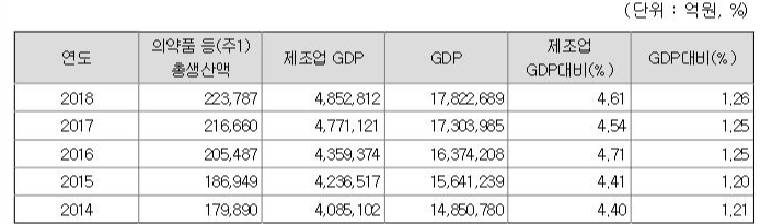 아래 표를 보시면 GDP대비 의약품 등의 총생산액은 꾸준히 증가하고 있습니다.
