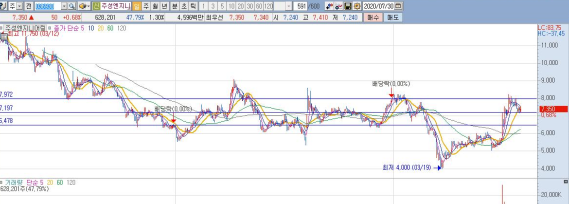 그래서 현재 주가는 7천원 초 중반대의 가격으로 하락한 상황이고요.