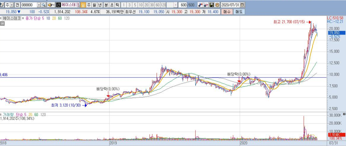 에이스테크 주가는 9500원의 저항 지점을 6월 말 돌파한 이후 가파른 상승세를 유지하였는데요.