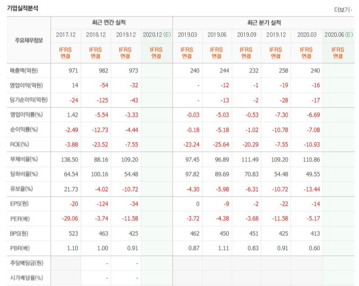 지난해의 실적을 보면 973억의 매출 및 32억원의 영업손실을 내며 전년과 비교하여 전혀 변화되지 못한 실망스러운 모습을 보여주었습니다.