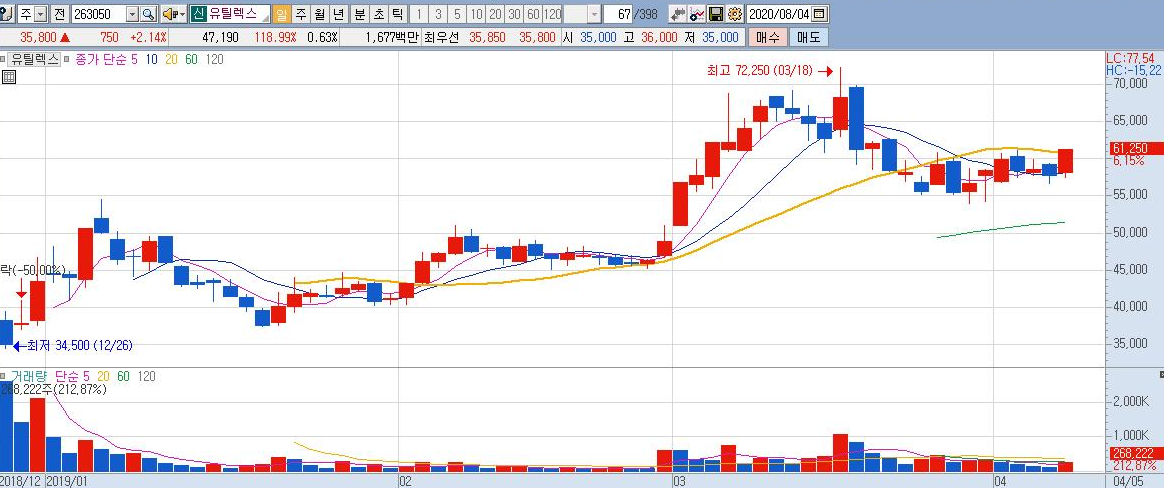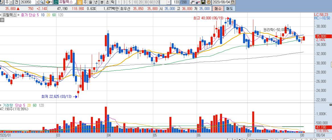 유틸렉스의 일봉 차트를 보도록 하죠.