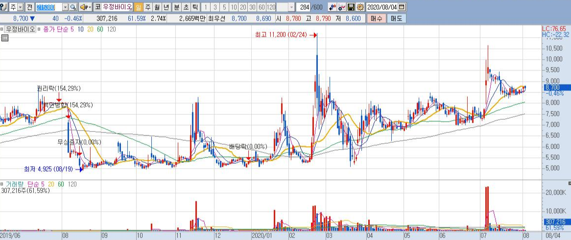 이러한 폭등장세 속에 우정바이오는 물론 상승흐름을 유지했으나 다소 지지부진한 흐름이었다고 말씀드릴 수도 있겠네요.