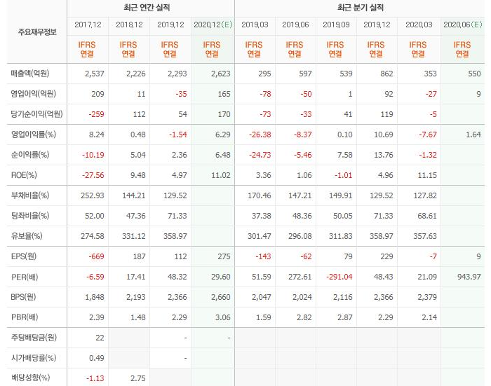 최근의 연간 매출 상황을 보면 매출액은 다소 정체되어 있고 영업이익은 하락하는 추세에 있네요.
