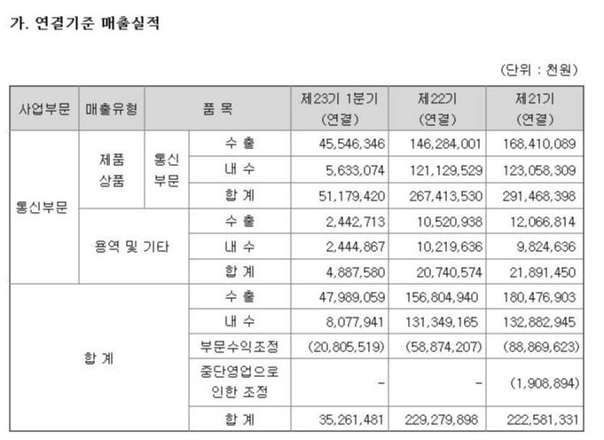 매출의 상세 현황을 분석해보면 통신관련 제품의 수출실적이 상향되고 있고 내수는 국내 경기 부진과 맞물려 1분기 상당히 부진했습니다.