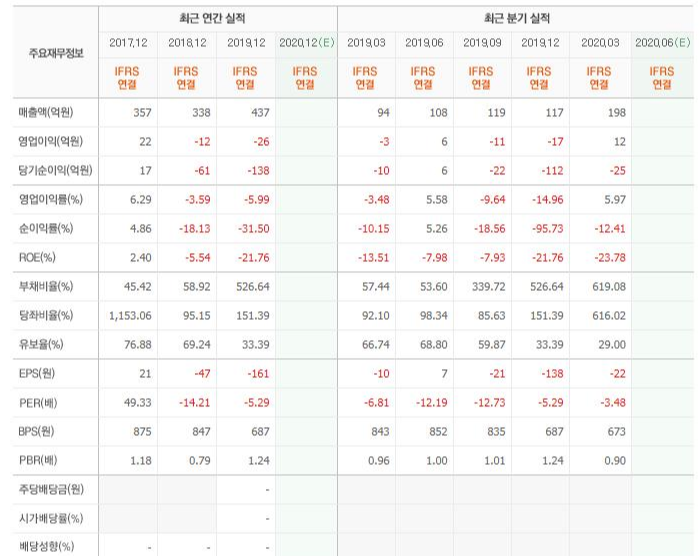 2018년 적자전환 이후 2019년에는 당기순손실의 폭이 3배 이상 늘어났을 뿐만 아니라 부채비율은 현재 600% 이상 높아졌으니 주가의 지속적인 하락이 일면 이해는 됩니다.