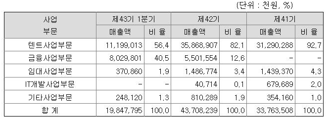 텐트사업부문에서 상당히 좋은 매출실적을 기록했네요.