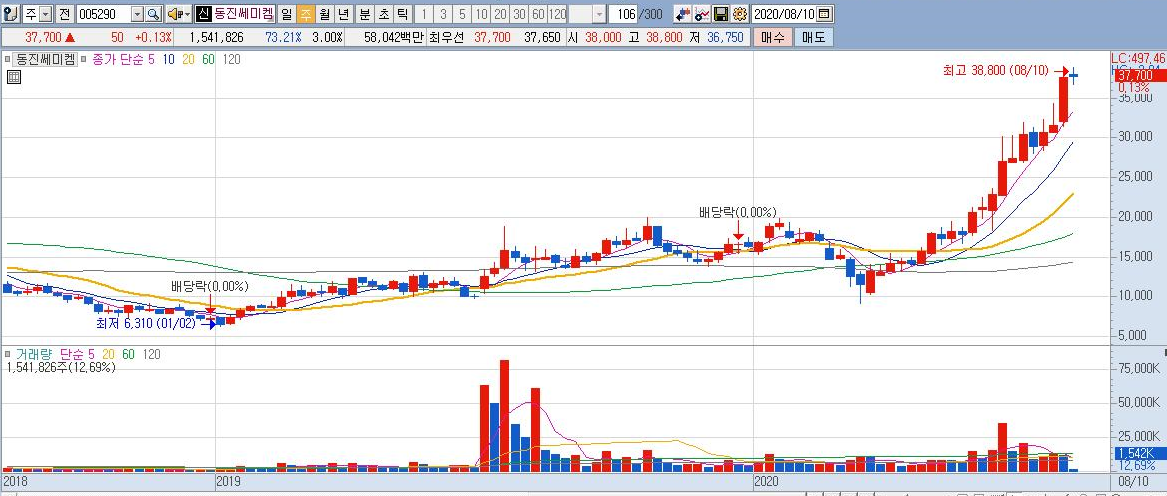 솔브레인, SK머티리얼즈, 한솔케미칼, 원익머터리얼즈, 이엔에프테크놀로지 등에 비해 동진쎄미켐의 상승률은 무서울 정도로 급등 흐름을 연출하고 있습니다.
