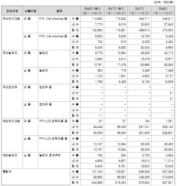 영업부문별로는 국내 전자재료 부문이 3.5% 정도 증가하였고 해외전자재료 부문은 14.7%의 높은 성장률을 기록하였습니다.