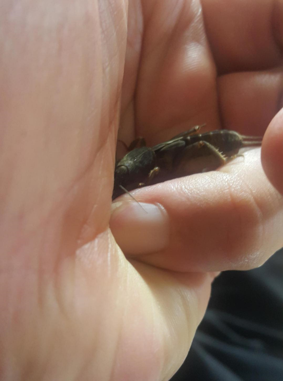 주먹을 살짝 쥐고 땅강아지를 손에 넣어 놓으면 앞 쪽의 양발로 마치 노를 젓듯이 구멍을 파헤치려고 할거에요.