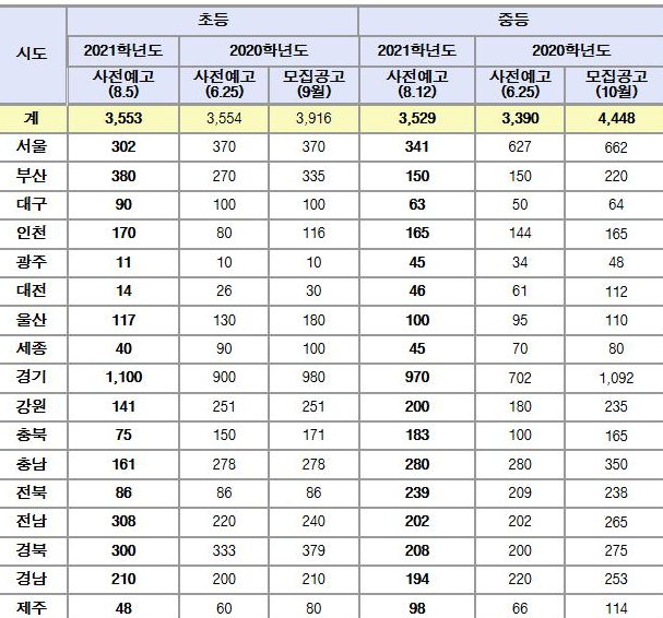 2021학년도 신규 임용 공립 초‧중등 교원의 사전예고를 살펴보니 선발인원이 굉장히 많이 줄어들었습니다.