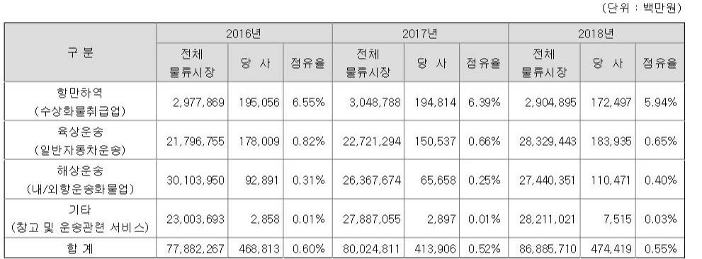 다행인 점은 육상 운송에서의 물류시장 규모가 크게 확대되며 점유율의 하락에도 불구하고 전체 금액상으로는 매출규모가 높아지고 있는 상황이라고 말씀드릴 수 있겠네요.