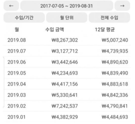 작년 1월부터 8월까지 수입 내용을 보면 2019년 7월 최저 312만원을 찍었고 8월의 경우에는 826만원이라는 엄청난 수익을 거두었네요.
