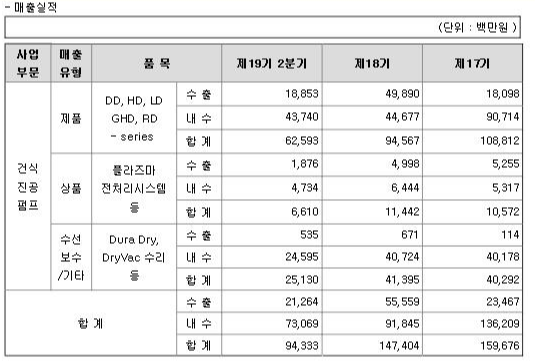 매출실적을 통해 확인해본 바로는 건식진공펌프에서 DD, HD, LD 등의 제품군에서 비중이 큰 것으로 확인이 되네요.