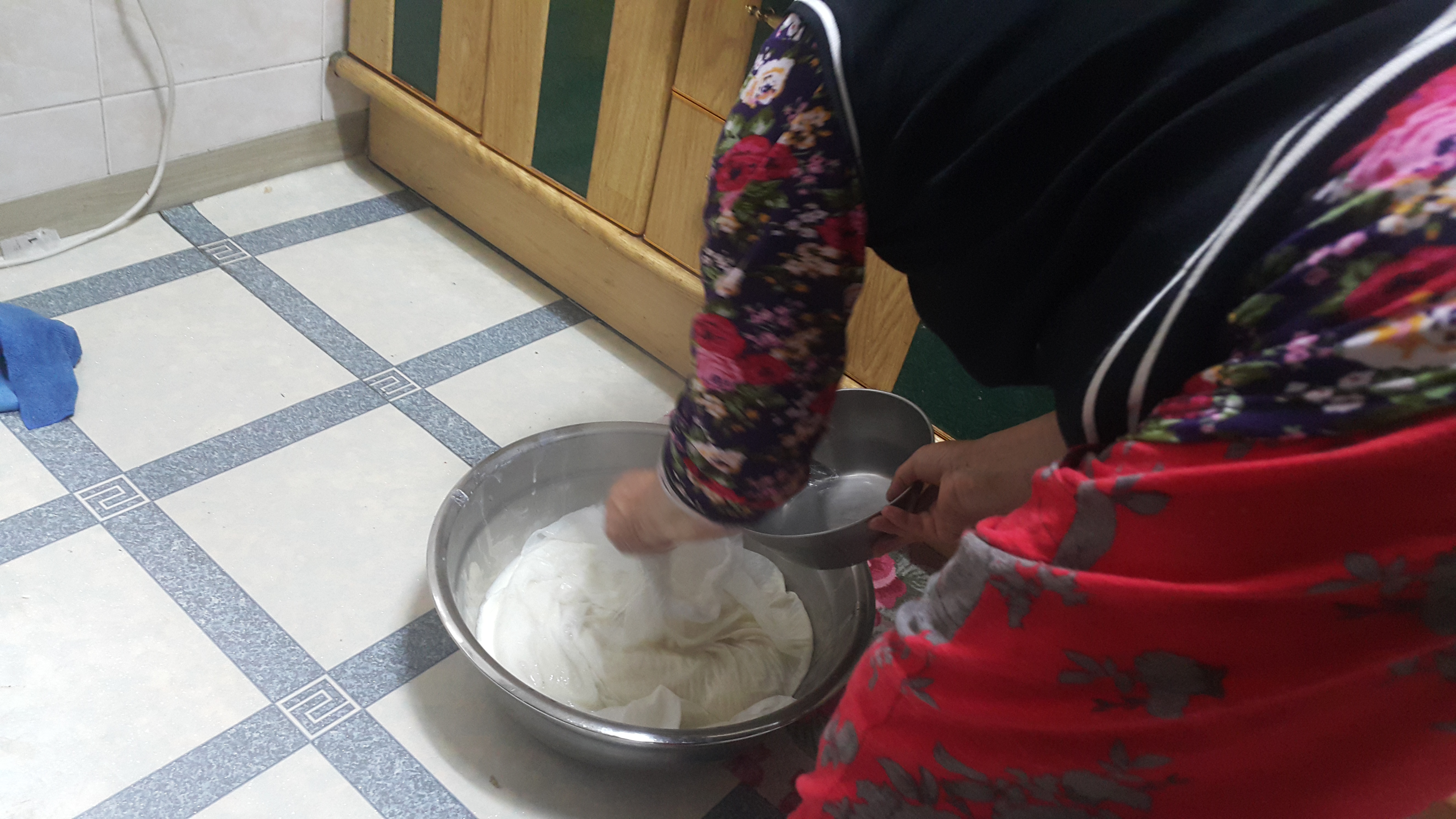 비지를 걸러낸 따뜻한 콩물에 간수를 조금씩 넣어가면서 응고되게 해주세요. 콩물이 몽글몽글 굳어진 게 우리가 즐겨 먹는 순두부랍니다. 순두부찌개 다들 좋아하시죠? 간수의 양을 얼마나 넣을지는 콩물의 양에 따라 다르니까 조금씩 넣어가면서 엄마말로는 잘 앵길 만큼(앵기다는 충청도에서 자주쓰는 표현이랍니다. 안기다 라는 뜻이에요. 서로 서로 잘 끌어안는다는 말인 것 같아요.) 넣어주세요.