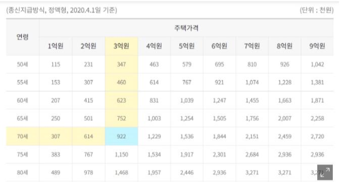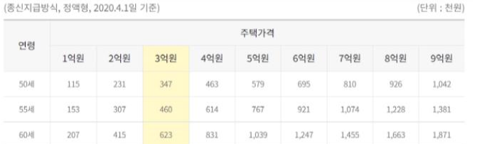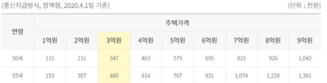 2. 만일 50세에 은퇴하시고 종신지급 방식으로 연금을 수령하신다면 시가 3억원 주택의 경우 34만 7천원을 수령할 수 있습니다.