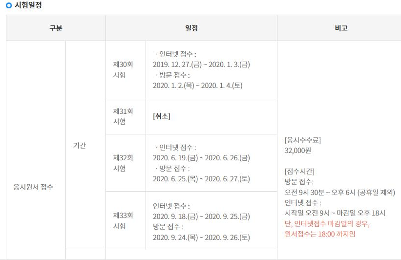 31회 시험도 코로나 상황으로 인해 취소된 바 있습니다.