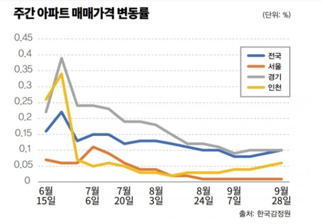 인천의 주간 아파트 매매가 변동률을 보실까요?