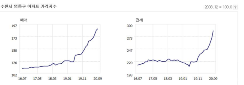 영통구의 아파트 가격지수는 2016년에 비해 현재 2배 가량 상승한 수치를 보이고 있습니다.