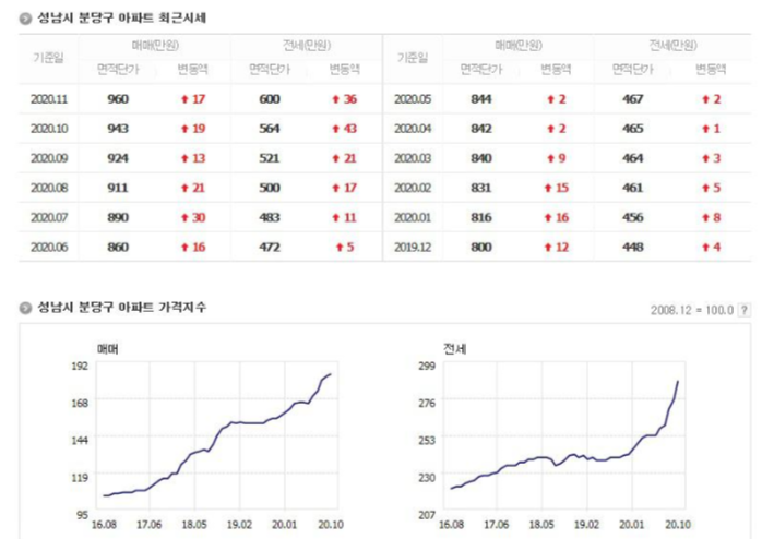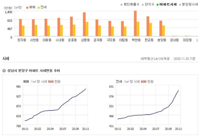 성남시 분당구의 경우 1㎡ 매매가는 960 만원의 시세를 형성하고 있으며 전세가는 1㎡ 당 600 만원에 육박하고 있습니다.
