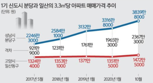 실제로 2017년 당시 분당구의 3.3㎡당 아파트 평균 매매가격이 2246만원 가량이었고 일산동구쪽은 1324만원 정도로 대략적으로 921만원의 시세차이를 보였습니다.