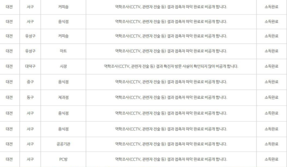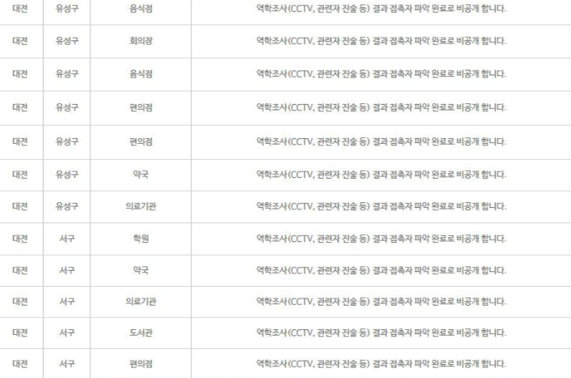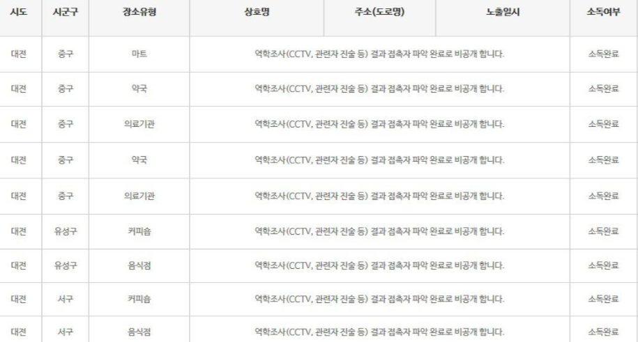 (공개기간) 정보 확인 시 ~ 마지막 접촉자와 접촉한 날로부터 14일 경과 시(기간 경과 시 비공개). (개인정보) 성별, 연령, 국적, 거주지 및 직장명 등 개인을 특정하는 정보를 공개하지 않음. 읍ㆍ면ㆍ동 단위 이하 정보는 공개하지 않음 (공개시기) 코로나19는 증상 발생 2일 전부터 격리일까지 공개함(무증상 확진자는 검체채취 2일전) (공개원칙) 확진자의 접촉자가 발생한 장소 및 이동수단을 공개함(가능한 범위 내에서 공간적, 시간적 정보를 특정해서 공개함) ※ 개인별 이동경로 형태가 아닌 공개 범위에 해당하는 모든 장소 목록 형태로 정보를 공개함 ※ 해당 공간 내 모든 접촉자가 파악된 경우 공개하지 않음(비공개 전환) ※ 역학조사(카드조회, 추가진술) 결과 또는 타지역 확진환자 대전 방문 시 이동경로 추가될 수 있음