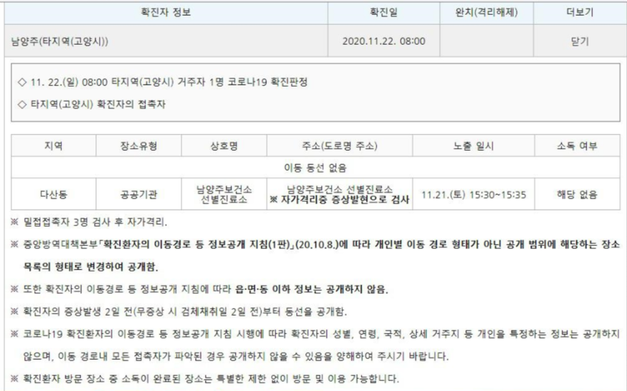 다음은 11월달의 남양주 코로나 확진자 세부사항입니다.