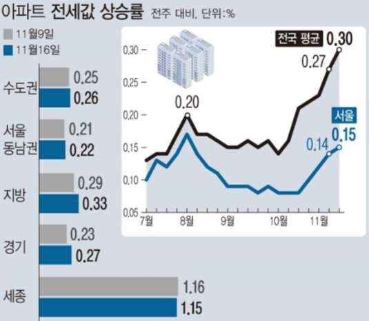 전세시장의 경우 최근에 경기권은 주간 상승률이 0.27%에 달하고 있습니다.