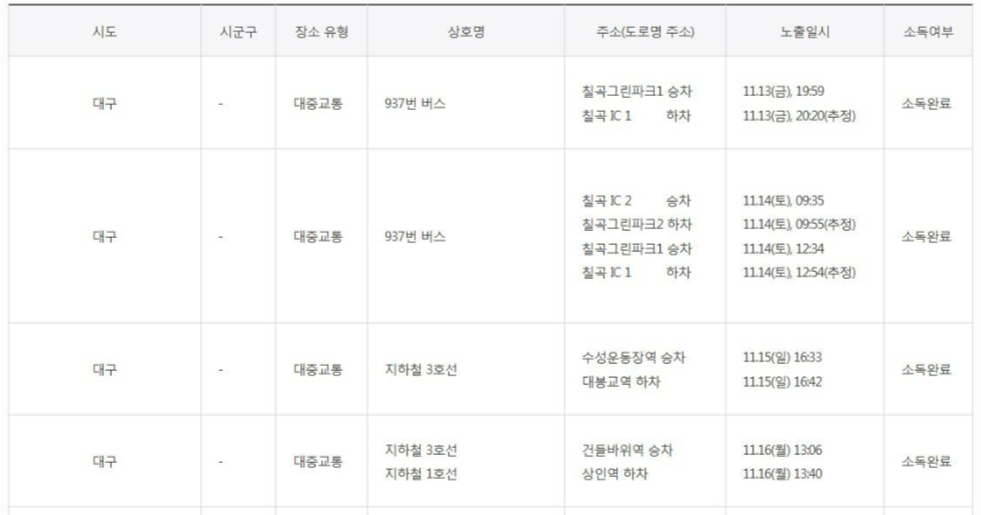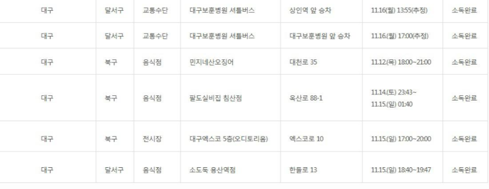 대구 보훈병원 셔틀버스와 민지네 산오징어, 팔도실비집 침산점, 대구엑스코 5층의 오디토리움, 소도둑 용산역점 등에서 확진자의 이동경로가 파악되었습니다.