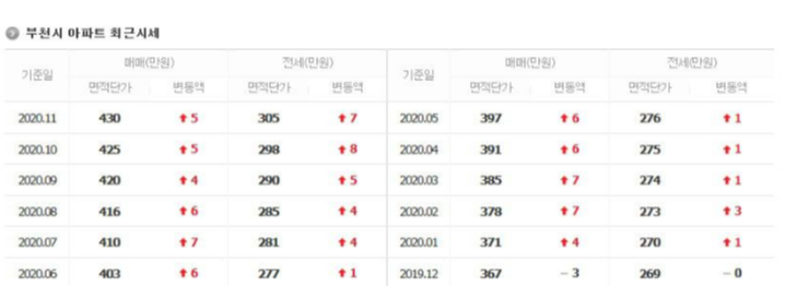 부천시 아파트의 최근 몇 달간의 시세입니다.