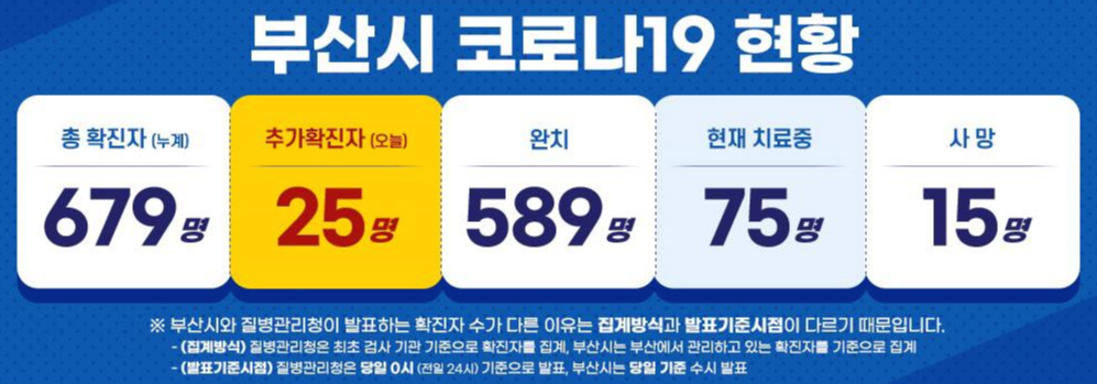 부산시 확진자 현황을 말씀드리겠습니다. 오늘 현재 확진자는 18명이 추가되어 총 654명에 이르고 있습니다. 부산진구의 초연음악실 관련 접촉자는 14명이며 타지역 접촉자는 3명이 발생하였습니다. 현재 감염경로를 조사 중에 있으며 그 인원은 1명입니다.