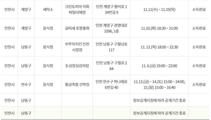 정보공개 지침에 따라 해당 영업장에 대한 정보는 일정기간 인천시청 홈페이지를 통해 공개 후 기간이 만료되면 정보 공개를 중지하게 됩니다.