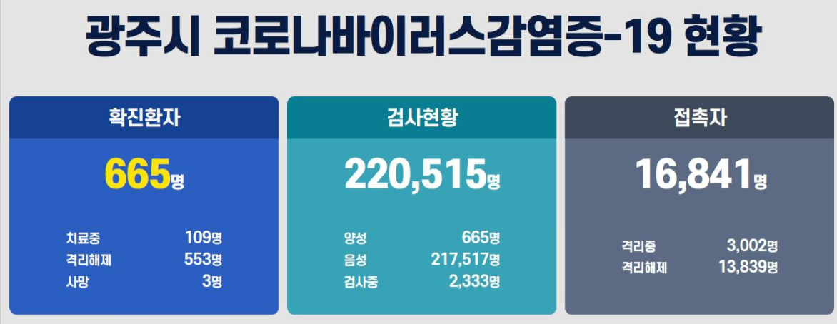 광주의 확진자 숫자는 오늘 3명이 또 다시 추가되어 누적 인원이 벌써 665명을 기록하고 있습니다.