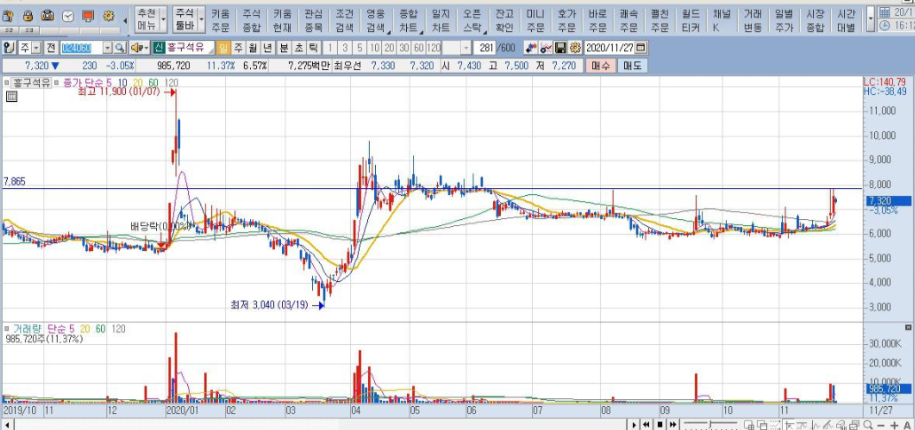 흥구석유는 올 한해 제가 2차례 매매를 통해 500만원 정도의 수익을 가져다 준 종목으로 새로운 진입시점을 기다리고 있는 상황입니다.