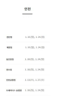 다음은 인천 검단점, 계양점, 동인천점, 연수점, 인천공항점,트레이더스 송림점 이마트 휴무일입니다.