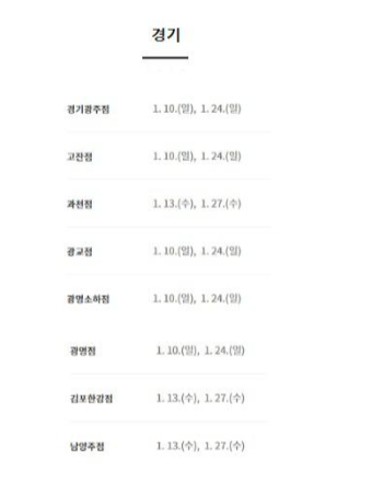 다음은 경기 광주점, 고잔점, 과천점, 광교점, 광명소하점, 광명점, 김포한강점, 남양주점 등의 이마트 휴무일입니다.