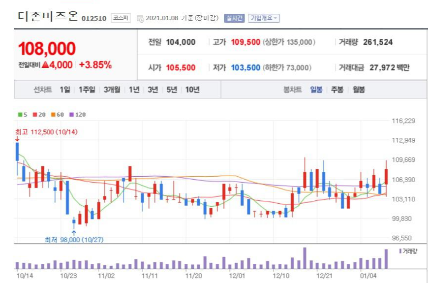 실제로 더존비즈온의 최근 몇 개월간 주가 추이를 보더라고 10만원에서 11만원 사이에 박스권의 흐름을 벗어나지 못하고 있죠.