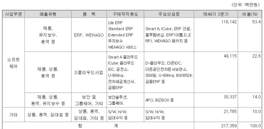 기업용 소프트웨어를 개발 및 판매하는 사업을 진행하고 있으며 클라우드 서비스, ERP, 플랫폼 서비스, 전자세금계산서 발행 및 결제 등에 관한 전자금융서비스, 보안, 모바일 솔루션, 그룹웨어 서비스 등 을 제공한다. |