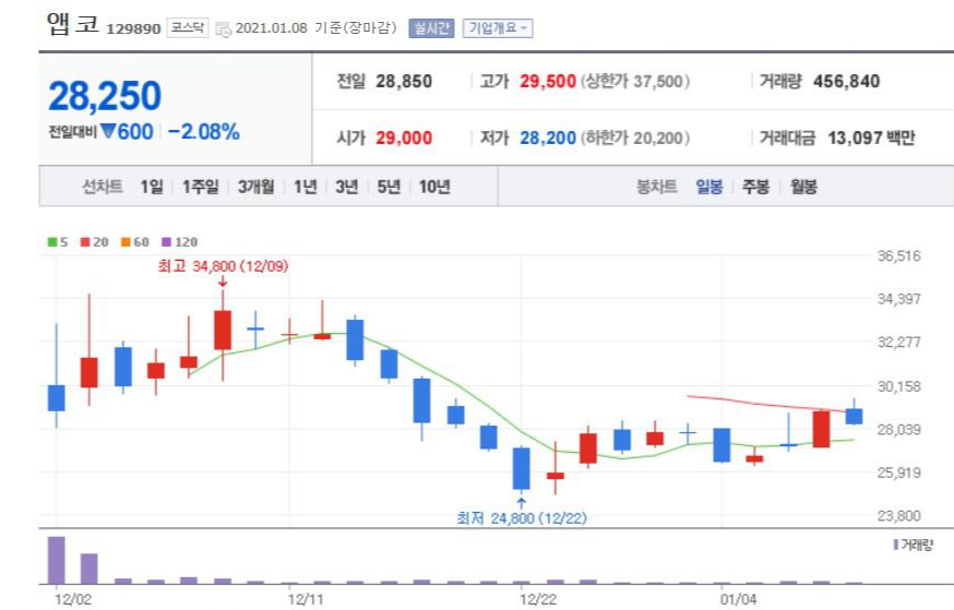 앱코는 상장 초기 급등세를 연출하며 일주일만에 최고점인 34,800원을 찍었지만 코로나 상황으로 각종 상업지역의 영업규제가 잇따르면서 직격탄을 맞았습니다.