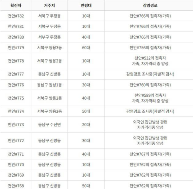 1) 천안 760번 및 761번: 두정동 거주(30대)하며 자발적 검사로 양성 판정 2) 천안 766번: 두정동 거주(70대)하며 자발적 검사로 양성 판정 3) 천안 757번: 다가동 거주하는(70대)하며 자가격리 중에 양성 판정 * 581번 확진자의 가족 4) 천안 758번 및 759번: 기존 확진자의 밀접 접촉자 검사를 받고 양성판정 5) 천안 762번 ~ 765번: 기존 확진자의 밀접 접촉자 검사를 받고 양성판정 |