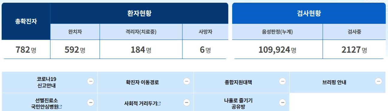 현재까지 총확진자는 782명이며 6명의 사망자가 발생하였고 격리자는 184명, 검사중인 분들의 숫자가 2127명이기 때문에 천안시민 여러분들은 외출 자제 및 자발적 거리두기를 잘 실천할 필요가 있습니다.