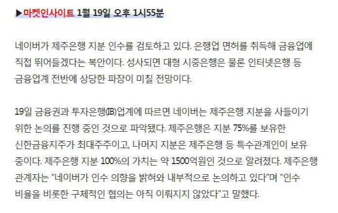기사의 대략적인 주요 내용은 은행업 라이센스를 취득하고자 하는 네이버가 제주은행의 지분을 인수하고자 한다는 것이었는데요.
